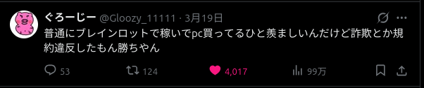 ポストの内容としてブレインロットのキャラクターを不当に販売しお金を稼ぎPCを購入しているユーザーを発見し、それに対して『羨ましい』『詐欺や規約違反をした人が有利』との不満だった。
